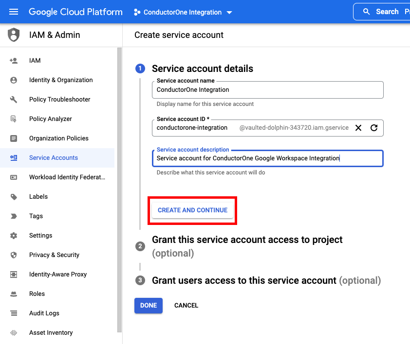 - Service account description: for example, “Service account for ConductorOne Google Workspace Integration”